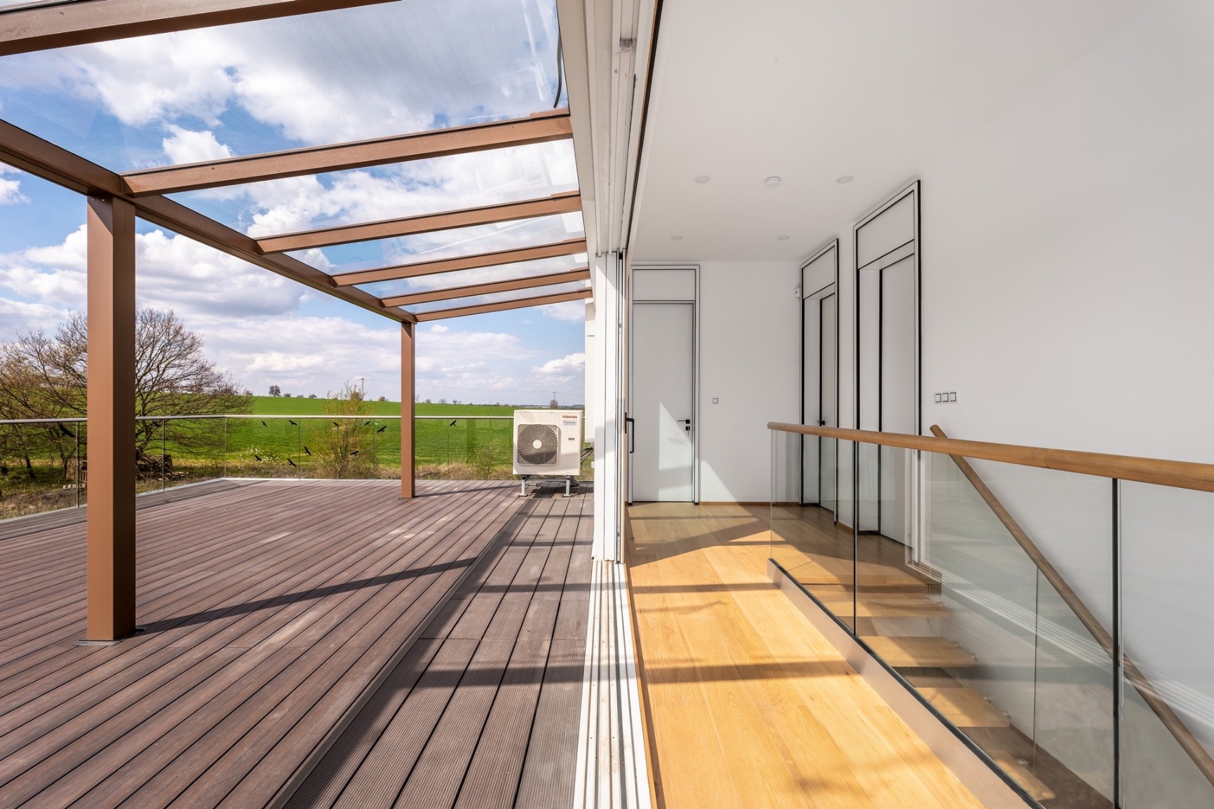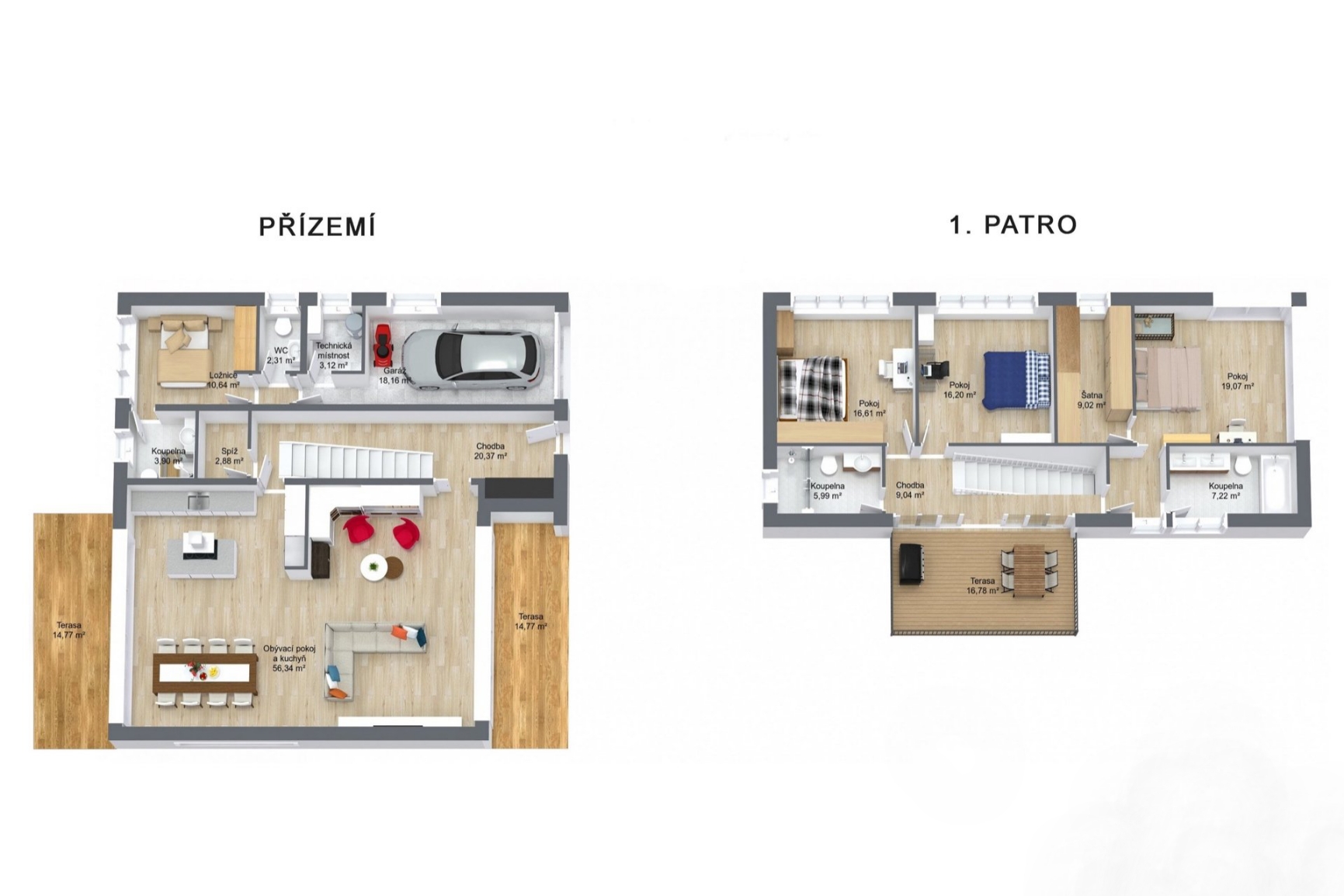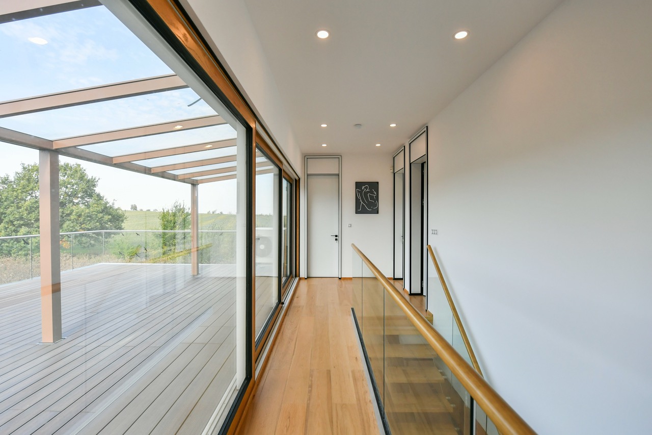 Dům byl navržen s důrazem na velkorysost a světlo. Srdcem přízemí je otevřený obývací prostor s kuchyní a jídelnou, který plynule přechází na dvě terasy a do zahrady. Impozantní stropy o výšce 2,8 metrů a velkoformatova okna s trojskly dodávají interiéru vzdušnost a prosvětlení. V patře naleznete oázu klidu v podobě hlavní ložnice s vlastní koupelnou a šatnou, dvou dalších ložnic a velkoryse 70 metrové terasy s pergolou, která je dokonalým místem pro soukromou relaxaci s výhledem do krajiny.